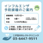 2025年9月25日 / 最終更新日 : 2025年9月25日 clinic 10月1日から2025年度の新型コロナワクチン接種を開始します ワクチンはファイザー社のコミナティを使用します。 費用は15,000円です、65歳以上または60歳以上で身体障害者1級相当の世田谷区民の方は助成が利用で2,500円の自己負担になります。 予約の際には電話で在庫の確認もお […]